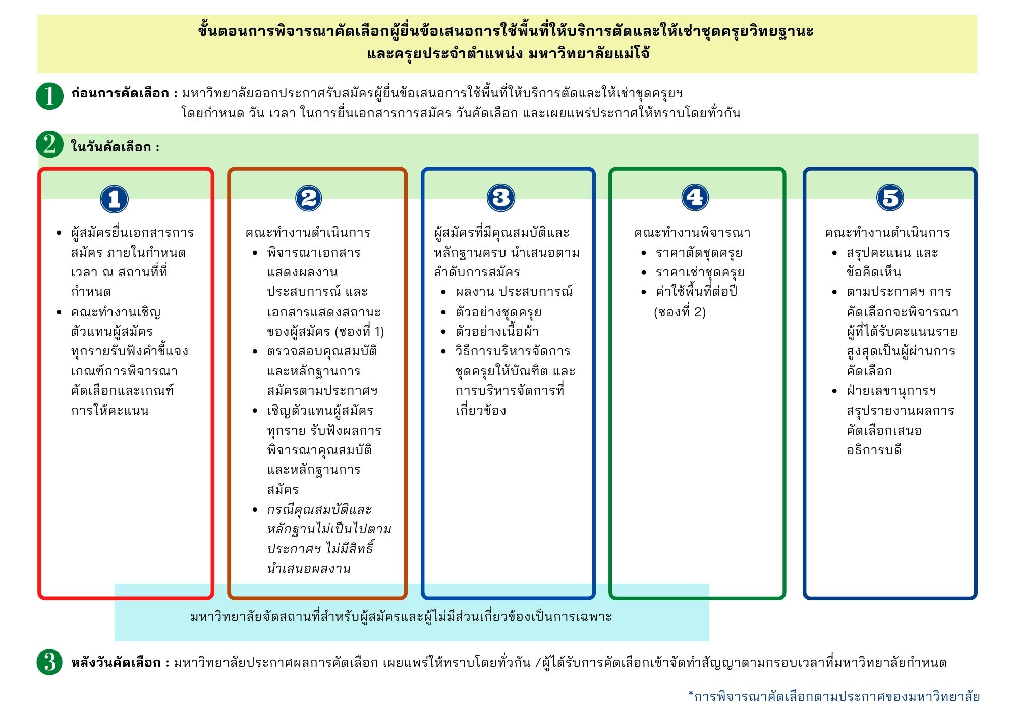 ขั้นตอนการพิจารณาคัดเลือกผู้ยื่นข้อเสนอการใช้พื้นที่บริการตัดและให้เช่าชุดครุยวิทยฐานะและครุยประจำตำแหน่ง มหาวิทยาลัยแม่โจ้